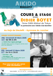 Dieulefit Aïkido et l’Aïkido Club Montilien,organisent un cours et un stage exceptionnel animé par Didier Boyet, 7e Dan Aïkikaï de Tokyo le 20, 21 et 22 mars 2026.